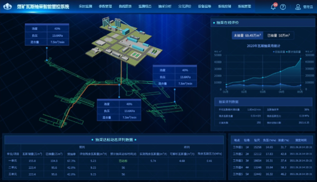 瓦斯抽采一体化智能管控系统:融合煤矿安全监控、电力监控、人员管理、视频监控、自动控制等系统,利用超声和激光精准感知、人工智能、二三维GIS等技术,实现瓦斯抽采泵站无人值守、管网智能调控、集放水智能管控、钻孔作业全过程智能监控、野外地面井抽采实时监控、抽采效果智能评判、工作面防突预测及瓦斯日分析信息化管理,达到瓦斯抽采系统信息化、自动化、智能化一体管控。