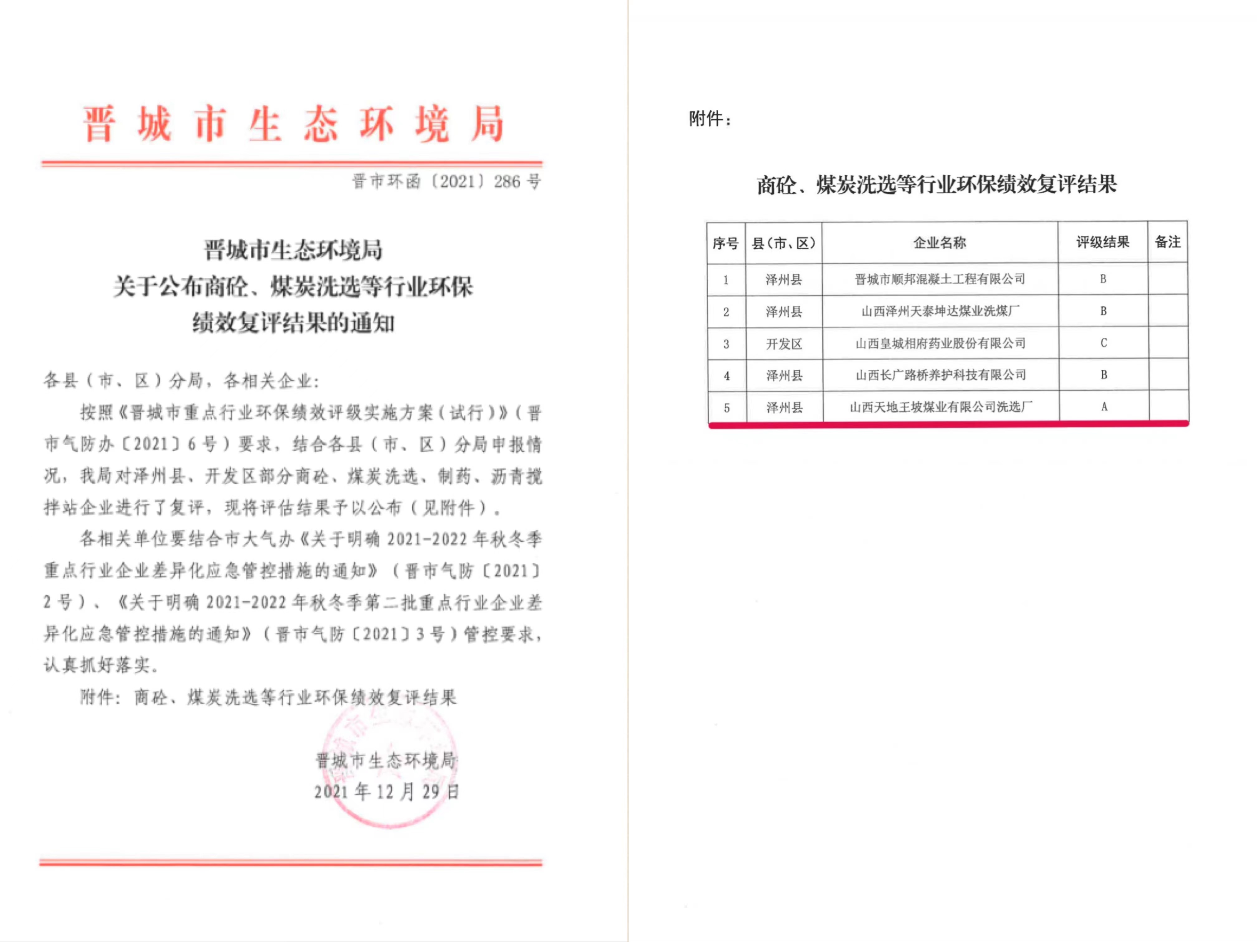 天地王坡洗选厂的环保工程完成了升级改造,且通过了山西省晋城市生态环境局组织专家复验,洗选厂环保绩效由B级提升为A级企业。