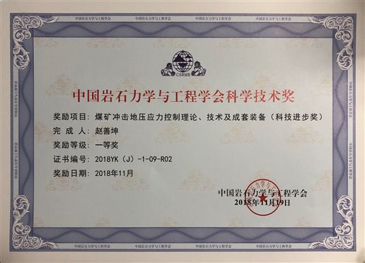 煤矿冲击地压应力控制理论、关键技术及成套装备,2018年,中国岩石力学与工程学会,省部一等奖,排名第2;