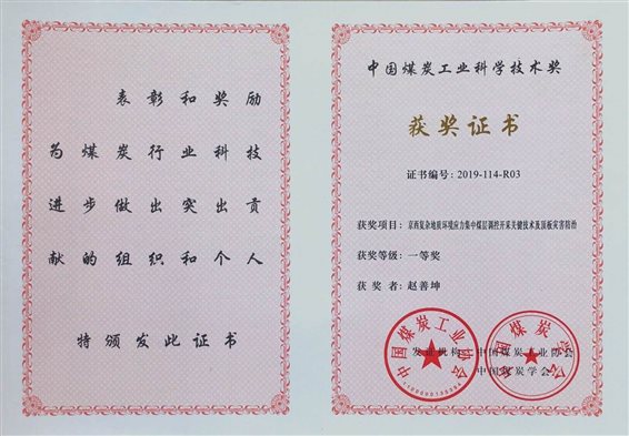 京西复杂地质环境应力集中煤层调控开采关键技术及顶板灾害防治,2019年,中国煤炭工业协会,省部一等奖,排名第3;