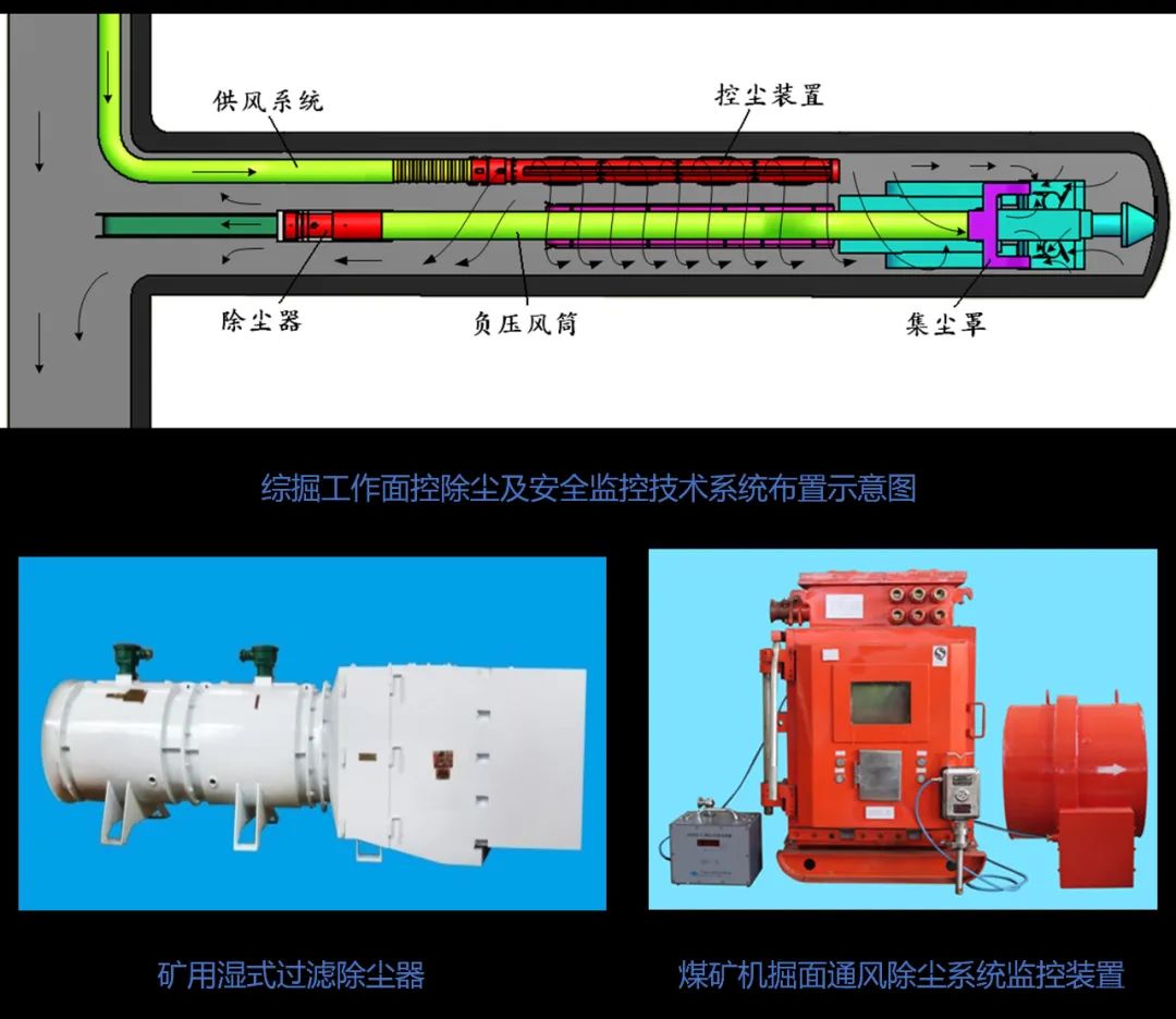 综掘工作面控除尘及安全监控技术:利用除尘器运行中产生的负压,通过吸尘风筒与靠近尘源的吸尘罩,在尘源处造成一个负压区,使含尘空气由吸尘罩经吸尘风筒进入除尘器中净化处理;利用附壁射流控尘装置产生不断向工作面推进的旋转气流,将粉尘集中在掘进机司机区域前方,使之经过吸尘罩吸入除尘器中进行净化而不外流,从而提高系统除尘效率;实时监测压抽风量、瓦斯浓度、降尘效率等参数,自动调节压抽风量比使之处于合理区间,确保除尘系统高效、安全运行。