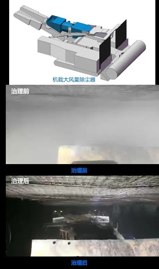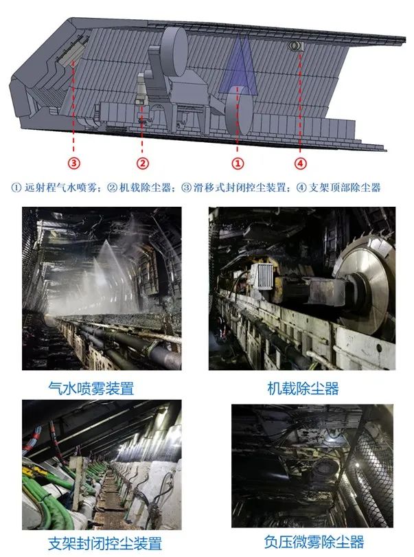 煤矿大采高综采和掘锚工作面粉尘分源治理及智能管控技术:在大采高综采面,综合利用滚筒三维包络高效喷雾、采煤机含尘气流控制、支架防尘装置以及负压微雾除尘装置,实现滚筒割煤、降柱移架两大尘源的有效治理;在快掘面,综合利用滚筒立体喷雾、柔性附壁风筒以及大风量机载除尘系统,实现迎头含尘气流的有效控制和高效抽吸净化;在主运巷道,综合利用沿程煤体润湿、皮带清洁、断面喷雾、除雾捕尘门等技术,实现粉尘有效治理,保证视线清晰;最后,基于全矿井粉尘监控系统及其控制策略,实现防尘信息的实时监测及系统的智能调控。