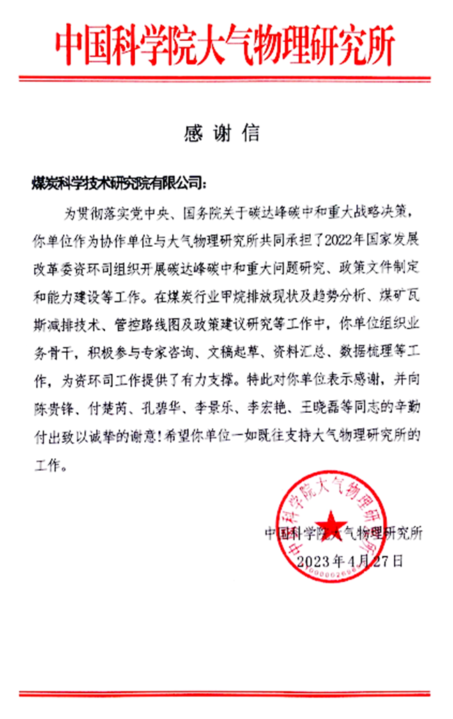 4月27日,中国科学院大气物理研究所向煤科院发来感谢信,对煤科院在《甲烷排放管控路径研究》课题项目中的专业素养表示肯定,对煤科院团队的爱岗敬业和辛勤付出表示感谢。