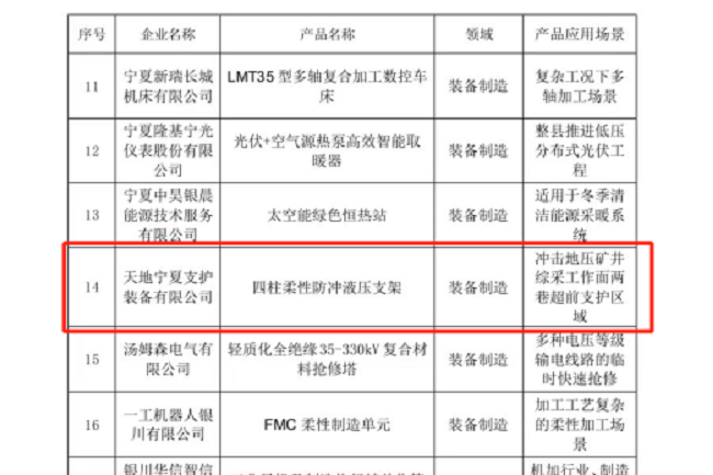 本次科技创新产品评选是银川市全面深入实施创新驱动发展战略,加快建设创新发展引领,鼓励引导企业开展自主创新的有力举措。“四柱柔性防冲液压支架”的成功入选,有力证明了天地支护的科技创新能力,推动公司在科技成果向产业化发展的道路上大步迈进。
